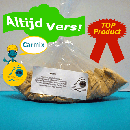 Binnen het Schildpaddencentrum worden dagelijks grote hoeveelheden Carmix verbruikt. De aanvoer is wekelijks en hierdoor ontvang je altijd Carmix voorzien van een recente productiedatum. Vanaf het moment van levering is Carmix dan ook gegarandeerd 3 maanden houdbaar.